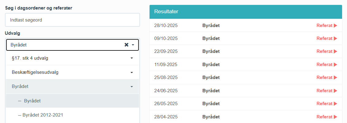 Her er oversigten fra byrådet inddelt i perioderne '2012-2021' og de nyere dagsordner og referater.