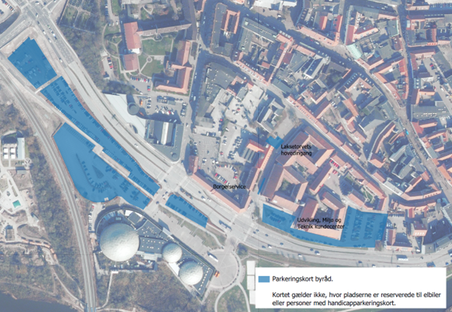 Som det fremgår af nedenstående kort, må I også parkere foran hovedindgangen på Laksetorvet. Der opfordres imidlertid til, at man i løbet af dagtimerne i videst muligt omfang benytter de øvrige parkeringspladser, da parkeringspladserne ved hovedindgangen ellers er reserveret til borgere, virksomheder og øvrige samarbejdspartnere, der har ærinde i borgerservice og på Laksetorvet.