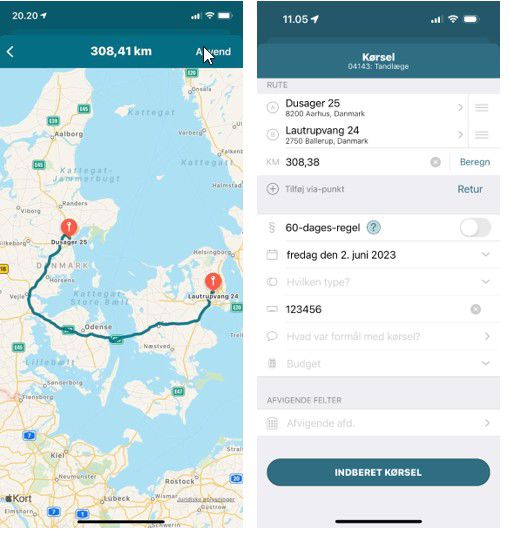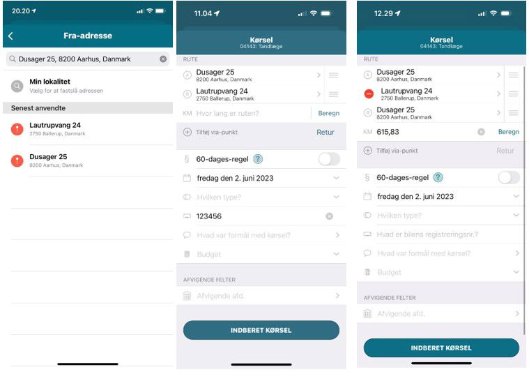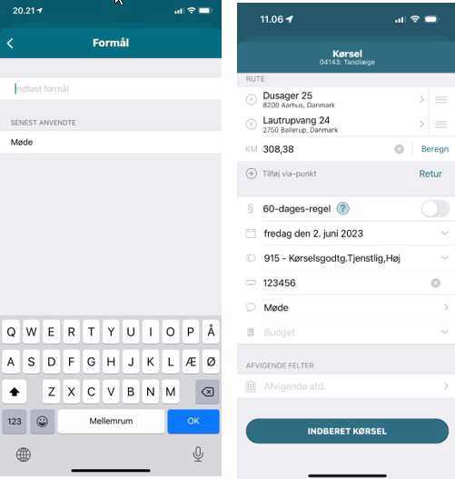 - Formål: Oplys formålet med kørslen (under formål kan du vælge "senest anvendte" fra en liste).