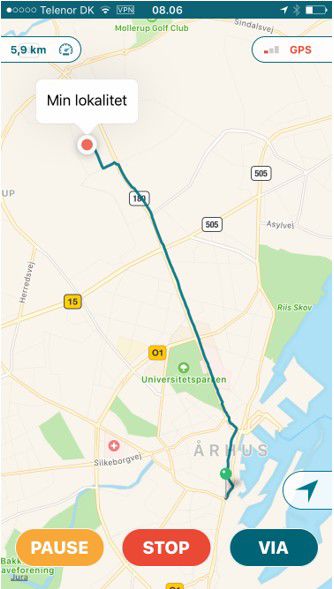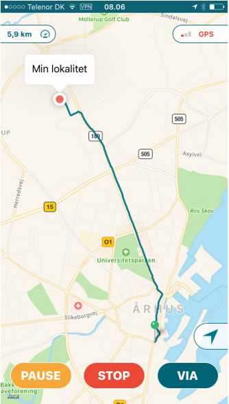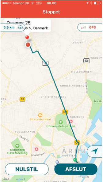 - STOP: Når du når frem til din destination, skal du trykke på "STOP", hvorefter ruten afsluttes og kilometertallet gemmes.