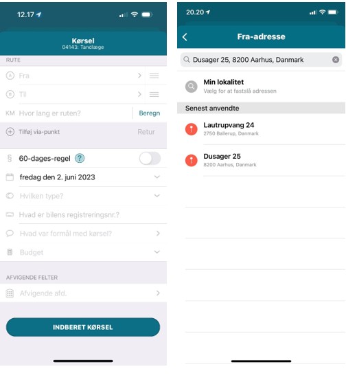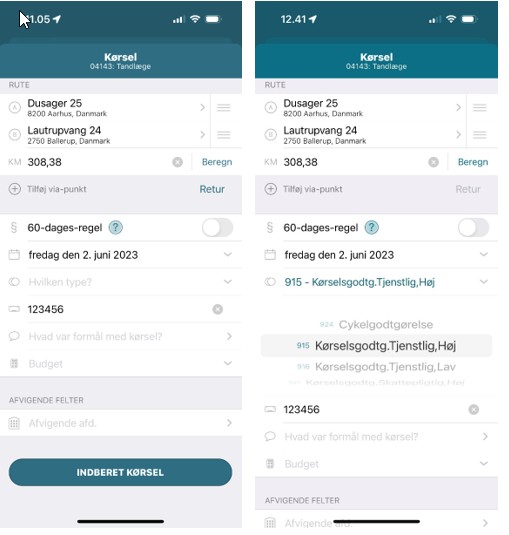 - Formål: Oplys formålet med kørslen (under formål kan du vælge "senest anvendte" fra en liste).