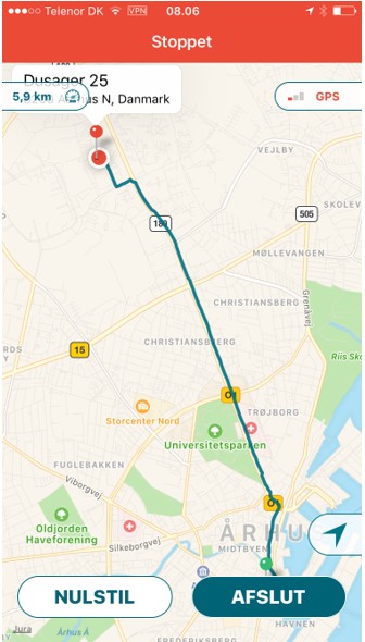Når du trykker på "STOP", præsenteres du for den rute og det antal kilometer, du har kørt.
